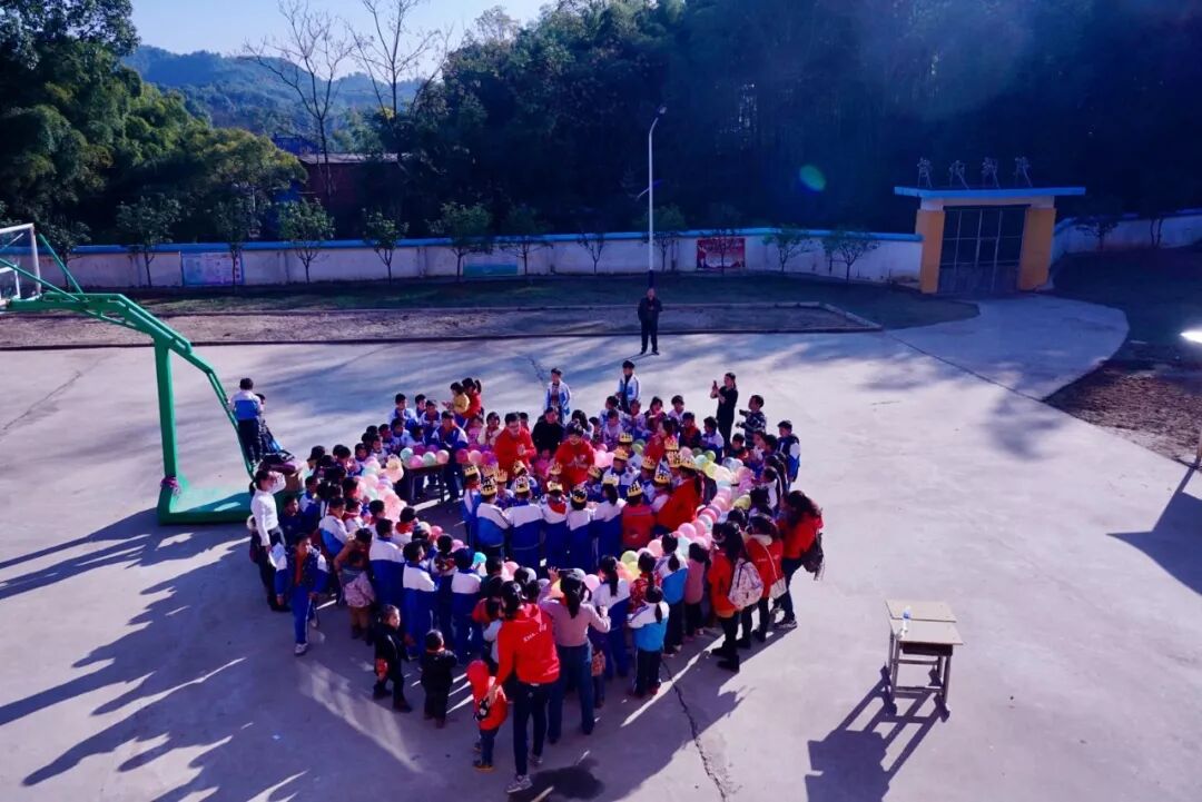 课后在操场上,志愿者和孩子们围绕成心形,为12月出生的小寿星们举办了一场温馨的集体生日会